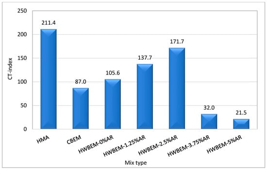 Figure 11 reports the CT indices found for the studied mixtures. As expected, the CTindex of HMA shows superior characteristics to that of the CBEM. It is known that the CTindex for asphalt mixture ranges from 31 to 255 [55]. Moreover, the HWBEM, after being extensively heat-treated, demonstrates a slight improvement in the CTindex when compared with that of the CBEM. On the other hand, adding AR in an amount up to led to a continued improvement in the CTindex. Now, the criterion for an optimum value for the AR content will need to be discussed. As expected enough now, adding AR in an amount greater than 2.5% caused the mixtures to show a little tolerance to cracking. What is understood from the literature is that the CTindex depends on various factors, namely failure energy, the slope of the post-peak inflection point, and the strain value at 75% of the peak load value. These indices are highly affected by the ingredients of the mixture and volumetric properties. Noticeably, in terms of volumetric properties, Figure 4 and Figure 5 demonstrate the lower density and higher air void for the HWBEM containing more than 2.5% of AR. In terms of ingredients, AR extends a reinforced network within the binder (emulsion residue), leading to improved adhesion and cohesion, and ultimately enhancing crack resistance. Inversely, the extra AR predominated the binder materials and affected the role of the binder material, whereas the created networks dispersed the binder, affecting adhesion and cohesion inferiorly.