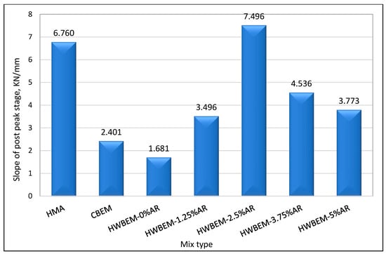 As mentioned previously, the slope of the curve in the mixture’s post-peak behaviour (m75) is one of the factors that affect the magnitude of CTindex; theoretically, the sharper the slope, the smaller the CTindex. In other words, a sharper slope indicates that the mixture has a weaker ability to tolerate the onset of cracking and less resistance to cracking propagation after the maximum tensile stress is borne. The slope of the mixtures’ behaviour in their post-peak stage was studied and is presented in Figure 12. However, the previous claim is correct only when comparing the CBEM with HWBEM-0%AR. Inversely, the remaining m75 values results show higher magnitudes. Moreover, some mixtures with a higher CTindex are associate with a higher m75, as for example, in the case of HWBEM-1.25%AR compared with HWBEM-5%AR. Therefore, it would lead to fruitless results to use the m75 slope index result alone to evaluate the cracking resistance. Its effect must be accommodated inclusively within the CTindex.