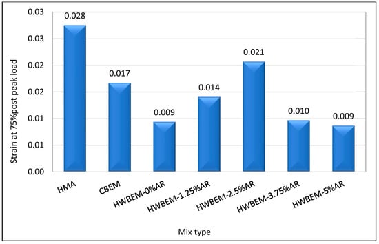 The strain at 75% of the post-peak load can reflect the brittleness of the asphalt mixture and/or crack initiation, whereas the higher value is associated with ductile material. Results in Figure 13 demonstrate such an indicator, where the hydric filler material in the CBEM produced the secondary binder (hydridic products have brittle characteristics) that controlled the ability of the asphalt binder (primary binder) to be ductile. However, introducing the heat treatment increased the brittleness as a result of extra hydraulic product creation due to the microwave heating process. This is also confirmed by the value of Pmax and/or ITS, as shown in Figure 6, when comparing the CBEM with the HWBEM with up to 2.5% of AR. Then, the inferior effect of extra AR and volumetric properties works to weaken the mixture with higher amounts of AR. Nevertheless, a controlled dosage of AR of up to 2.5% facilitates there being greater ductility for the mix due to the polymer-created network that reinforces the binders (both primary and secondary binders). Additional conformation can be confirmed through observing Figure 8, where the crack initiation energy is negatively affected by heating but AR inclusion rises to 2.5%.