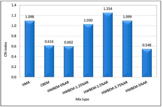 The CRI-index can reveal the normalization of different mixtures against crack resistance, as it is determined by dividing the failure energy (Gf) over the peak load (Pmax). Comparing Figure 7 with Figure 14, the same trend can be observed, but there is a noticeable variation in the ratio. An explanation for this would be the difference between these mixtures in their responses to loading. The load–displacement curve provides insights into the characteristics of a mixture. While a mixture might exhibit high peak load resistance, it may simultaneously possess a limited capacity to absorb energy. This relationship becomes apparent when considering the area under the load–displacement curve. However, Figure 14 reveals the significance of AR in extending the energy of failure noticeably with an increase in the peak load with less range, as can be seen with the HWBEM with up to 2.5% of AR.
