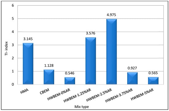 The toughness index (TI) demonstrates the post-cracking characteristics, or it explains to what extent post-cracking is associated with the total toughness of the material, where the brittle material has a significantly lower value compared with that of the ductile material. However, the highest toughness index obtained for HWBEM-2.5%AR is further proof of the effect of AR (of up to 2.5% in content) in improving the HWBEM’s performance, as can be seen in Figure 15. Both 1.25% and 2.5% AR contents caused the HWBEM to demonstrate much higher toughness than that of HMA itself. Furthermore, the heat treatment resulted in a minimization of the toughness index, as can be seen when comparing the CBEM with HWBEM-0%AR.