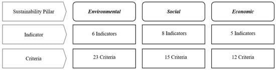 Pillars, indicators, and criteria: Our methodology is based on the three pillars of sustainability: environmental, economic, and social. For facilitating the data collection and analysis, the three pillars are divided into 19 indicators that consist of 50 criteria (the database) (see Figure 1).