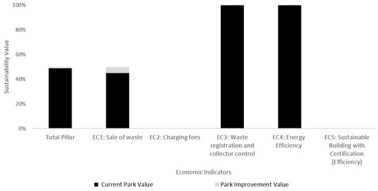 In second place, the economic pillar obtained a sustainability value of 49%. The indicators charging fees (EC2) and (efficiency) (EC5) both have the lowest current park value of 0% since the Cárcamos Park charges no fees (entrance, workshop, or rent-space fees) and sustainable construction criteria are not applied. The other areas of opportunity are economic resources generated from the sale of waste (EC1). The park currently collects, separates, and sells 11 types of recyclable materials without considering resale value.