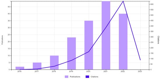 The above chart compares the total number of indexed publications and citations per year from 2016 to 2022, revealing a constant, gradual growth in the two indexes analyzed. The first year, 2016, had only two publications, and the highest peak was reached in 2021 with 49 published articles. The sample ends in 2022 with nine fewer articles (i.e., 40). These results verify a considerable increase that occurred during the entire period, except for a small decline in the last year. The number of citations grew rapidly over time given that, in 2017, only five citations appear but the final number in 2022 is 628.