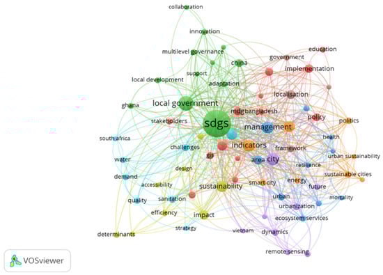VOSviewer can also filter the keywords according to a given minimum number of occurrences, which in this case was three. All the keywords that fit this criterion were included in the results, which comprised a set of 71 keywords grouped into eight clusters. The key words we co-opted with the highest frequency and their consequent representation in clusters of greater intensity are as follows: SDGs, sustainability, management, indicators, and local government.