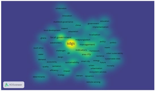 Density maps thus show the most and least linked keywords more clearly via their color and location on the map. This information reveals the areas in which keywords more frequently co-occur as these keywords are positioned in the map’s center to indicate their greater degree of connection with the other keywords. Figure 3 contains the density map generated by VOSviewer. A large concentration appears around the keyword ‘SDGs’, and other words with lower density are spread out around it. The closest terms to the central word are ‘local government’, ‘management’, ‘indicators’, ‘area’, and ‘city’.