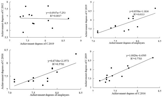 The correlations of graduation requirement achievement degrees of different classes are shown in Figure 1. There exists a significantly positive correlation (p < 0.01) between the graduation requirement achievement degrees of C.2016 and those of C.2019 (R2 = 0.7783). This may be because the supporting courses of both C.2016 and C.2019 referred to the standards of engineering education accreditation, and their achievement degrees were governed by the same factor—engineering education accreditation. However, there exists no significant positive correlation between those of C.2012 and those of C.2019, possibly because the courses for C.2012 did not refer to the standards of engineering education accreditation. Additionally, the graduation requirement achievement degrees of employers were also found to be significantly positively correlated with those of C.2016 and C.2019 (R2 = 0.5781 and 0.6113), which illustrates the concordance between the employers’ and the students’ evaluation of these tasks. Meanwhile, the relatively lower coefficients (R2 = 0.5781 and 0.6113) indicate the differences between evaluated values provided by employers and the students.