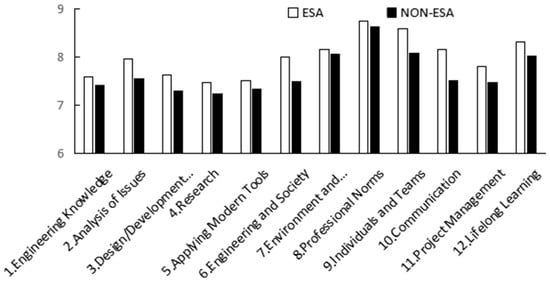 The evaluated achievement degrees by the students frequently participating in extracurricular scientific activities (ESA) are observed to be obviously higher than those not participating in extracurricular scientific activities (NON-ESA) (Figure 2). Different indexes of graduation requirements have different degrees between ESA and NON-ESA. The indexes of “6. Engineering and Society”, “9. Individuals and Teams” and “10. Communication” have increased ranges of more than 0.5, those of “2. Analysis of Issues”, “3. Design/Development Solutions”, “11. Project Management” and “12. Lifelong Learning” increased with ranges between 0.3 and 0.5, and those of “7. Environment and Sustainable Development” and “8. Professional Norms” have increased ranges of less than 0.1. Therefore, extracurricular scientific activities appear to have a great effect on students’ abilities relating to teamwork, social responsibility, communication and consultation, analyzing and solving problems, and independent learning, while extracurricular scientific activities contribute relatively less to the level of engineering ethics. It is of great significance to integrate extracurricular scientific activities into the cultivation of talents for the improvement of graduation requirement achievements and achieving training goals, especially the level of engineering knowledge and engineering practice.
