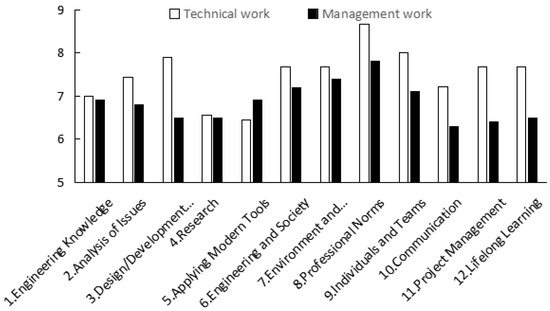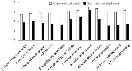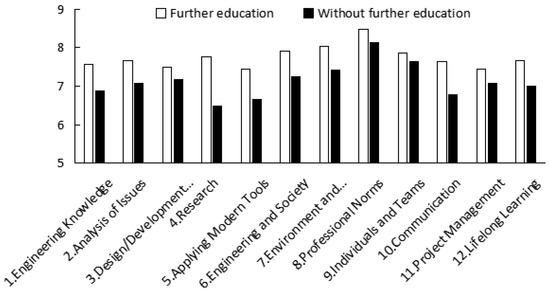 The training objectives are the expected abilities that students should have attained 5 years after graduation, and the realization of training objectives is based on the achievement degrees of graduation requirements [3,14]. So, the students of C.2016 are taken as an example to discuss the effect of post-graduation environmental factors on the achievement degrees of graduation requirements (Figure 3, Figure 4 and Figure 5). The students engaged in major-related work have increased achievement degrees compared with those not engaged in major-related work, with increasing ranges of 0.35–1.54 and average of 1.03 (Figure 3). This indicates that engaging in major-related work helps the achievement of training objectives and graduation requirements. Figure 4 presents the difference in evaluated achievement degrees of graduation requirements by students engaged in management works and by those engaged in technical works. The evaluated achievement degrees of indexes of “1. Engineering Knowledge” and “4. Research” by students engaging in management works display no obvious difference from those engaging in technical works. The evaluated achievement degrees of other indexes by students engaging in technical work are generally higher than those by students engaging in management work except for the index of “5. Applying Modern Tools”, especially with the increasing range of more than 1.0 of “3. Design/Development Solutions”, “11. Project Management” and “12. Lifelong Learning”, indicating that technical work strengthens students’ abilities regarding resolving problems, professional norms, management and relearning. Figure 5 compares the evaluated achievement degrees of graduation requirements by students with further education and those without further education. The achievement degrees of indexes of “1. Engineering Knowledge”, “2. Analysis of Issues”, “4. Research”, “5. Applying Modern Tools”, “6. Engineering and Society”, “7. Environment and Sustainable Development”, “10. Communication” and “12. Lifelong Learning” among students with further education are significantly higher than those among students without further education, which is closely related to re-education and relearning. So, the effect of post-graduation environmental factors on graduation requirement achievement should be noted. It also seems that post-graduation environmental factors contribute to all aspects of graduation requirement achievement.