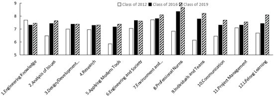 Figure 6 represents the evaluated achievement degrees of graduation requirements of different classes. The curriculum for C.2012 did not refer to the standards of engineering education accreditation, and its index of “1. Engineering Knowledge” has a slightly higher achievement degree than that of C.2016 and C.2019. This may be because the curriculum system for C.2012 mainly focused on basic knowledge and skills, resulting in a high achievement degree of “1. Engineering Knowledge”. Meanwhile, other indexes for C.2012 have lower evaluated values than those for C.2016 and C.2019, especially the indexes of “2. Analysis of Issues”, “5. Applying Modern Tools”, “8. Professional Norms”, “9. Individuals and Teams”, “10. Communication” and “12. Lifelong Learning”. Such results indicate that a curriculum system referring to the standards of engineering education accreditation greatly strengthens students’ social consciousness, ethics, engineering practice, lifelong learning, communication and consultation, and engineering leadership. Engineering education accreditation focuses on students’ abilities regarding professional norms, communication and leadership and relearning, which can promote students’ comprehensive qualities [29,37,38].