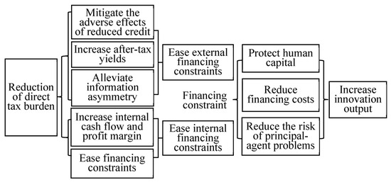 Secondly, from an external enterprise perspective, relying solely on internal financing for innovation amplifies its associated uncertainties and risks. It is evident that Chinese firms predominantly turn to financial institutions such as banks or venture investors for external financing [37]. As [38] highlighted, when bank credit tightens, riskier loans are often curtailed to maintain a balanced risk profile across the loan portfolio. Given the inherently high risk of innovative ventures, such banking behaviors undoubtedly impose external financing constraints on firms and transmit negative signals externally. However, when the government introduces tax policies aligned with innovation activities, tax reductions enhance firms’ post-tax returns. This not only sends a positive signal but also mitigates the information asymmetry inherent in innovation [14,39,40]. By broadening external financing avenues, the adverse impacts of reduced bank lending are neutralized, enabling firms to overcome potential innovation stagnation due to funding shortages, subsequently amplifying innovation output [41,42]. Thus, decreasing the direct tax burden can also bolster enterprise innovation output by alleviating external financing constraints.