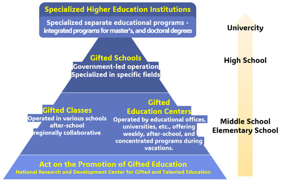 The Special Act on the Promotion of Gifted Education in South Korea provides the definition and fundamental framework for gifted education in the country. The enforcement decree of the law specifies the detailed provisions related to gifted education. Gifted education in South Korea is organized within a system consisting of gifted schools, gifted education institutes, and gifted classes, all governed by central government agencies and local educational authorities. Additionally, there is support from the Gifted Education Research Institute [5]. We have illustrated this system in Figure 1.