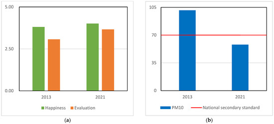 Province-level statistics for various years. (a) Residents’ happiness and evaluation of pollution governance; (b) PM10 and national secondary standard (70 μg/m3).
