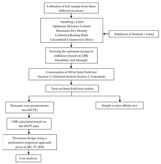 Figure 2 shows the experimental plan for the design of expansive soil stabilization with chemicals and limes. The soil samples were collected from three different locations for the laboratory experimental studies. The chemical varied from 0 to 1 kg/m3, and lime was used at 0, 2, and 3% by the weight of soil. The soil was tested for the free swelling index, moisture–density relationship, unconfined compressive strength, and California bearing ratio (CBR). The laboratory test results were used to arrive at the optimum dosage of chemicals and limes. Field trials were carried out by constructing a 100 m stretch divided into two sections. The first 50 m of test track was designated as Section I and was constructed with 1 kg/m3 Terrasil + 1 kg/m3 Zycobond + 3% lime and compacted to a depth of 250 mm. The second test section (Section II) was constructed with lime stabilization and compacted to a depth of 250 mm. The dynamic cone penetrometer test and simple water affinity test were carried out on the test track. The filed CBR was measured from the DCPT data and was compared with the laboratory data. The mechanistic–empirical approach given in IRC 37: 2018 [34] was used to design the pavement thickness.