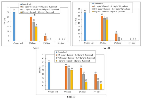 The free swelling index (FSI) of Soil-I, Soil-II, and Soil-III with and without different additives is shown in Figure 3. The FSI of Soil-I, Soil-II, and Soil-III is 30, 40, and 70%, respectively. The minerals in montmorillonite clay are the primary cause of the expensive soil’s swelling [36,37]. The swelling potential of soil was gradually reduced with the inclusion of various proportions of Terrasil, Zycobond, and lime as additives. The FSI was reduced with the addition of 1 kg/m3 of Terrasil and 1 kg/m3 of Zycobond in Soil-I, Soil-II, and Soil-III by 50, 25, and 29%, respectively, without the addition of lime. On the other hand, the FSI of Soil-I, Soil-II, and Soil-III dropped by a significant amount once lime was added. The FSI values of Soil-I and Soil-II are completely reduced by the addition of 3% lime, whereas Soil-III reduced by 79%. This is because the water affinity of the soil decreased as a result of the pozzolanic reaction, which binds the flocculated soil particles [38,39].
