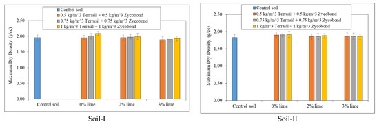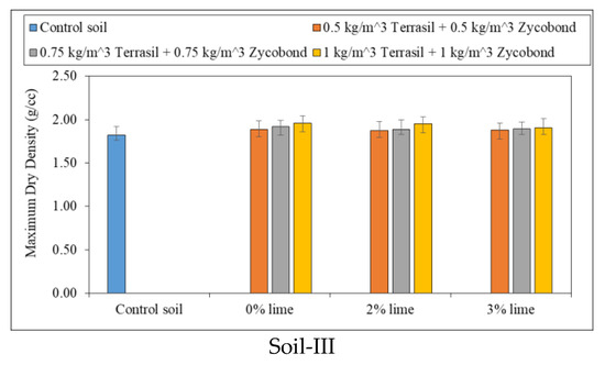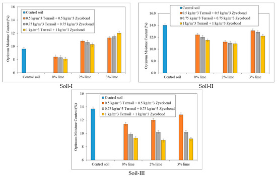 Figure 4 shows the MDD and OMC of Soil-I, Soil-II, and Soil-III with and without different additives. The OMC of Soil-I, Soil-II, and Soil-III is 9.6%, 14%, and 13.7%, respectively, without any additives. The OMC is reduced in three types of soils with the addition of Zycobond and Terrasil. After the addition of 1 kg/m3 of Terrasil and 1 kg/m3 of Zycobond, the amount of the OMC in Soil-I, Soil-II, and Soil-III reduced by 15%, 18%, and 29%, respectively. The use of Terrasil and Zycobond decreases the soil’s affinity for water, resulting in a lowering of the soil’s water content [40,41]. Similarly, the addition of lime along with Terrasil and Zycobond further reduces the OMC.