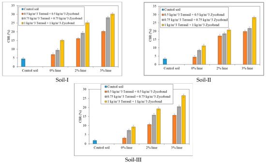 Figure 6 illustrates the variation in the CBR with and without using soil stabilizers. From the results, it can be noticed that the CBR of Soil-I, Soil-II, and Soil-III is 4.5%, 3.3%, and 1.86%, respectively, after 4 days of soaking without any additive. The CBR value of Soil-I, Soil-II, and Soil-III increased with the addition of 0.5, 0.75, and 1 kg/cum of Terrasil and Zycobond. Out of three different proportions 1 kg/m3 of Terrasil and Zycobond have the higher CBR value. The results are in line with the other researchers, Kushwaha et al. [4] and Eujine et al. [43]. There is a drastic improvement in the CBR value with the addition of lime. After the addition of 2% lime, the CBR value improved 3 to 4 times compared with the Terrasil and Zycobond soil samples without lime. Similarly, the CBR improved 5 to 6 times with the addition of 3% lime, with the same level of curing period.