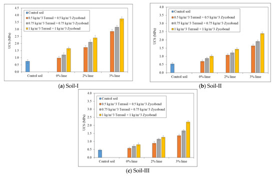 Figure 7 also shows the compressive strength of Soil-I, Soil-II, and Soil-III at different dosages of soil Terrasil, Zycobond, and lime. In the figure, it can be observed that the compressive strength of Soil-I, Soil-II, and Soil-III is 0.75 MPa, 0.61 MPa, and 0.47 MPa, respectively, after 7 days of curing without any additive. The Soil-I soil has a higher UCS value compared with Soil-II and Soil-III. It was observed from the results that the inclusion of Terrasil and Zycobond improved the soil strength after 7 days of curing. Out of three different proportions, 1 kg/cum of Terrasil and 1 kg/cum Zycobond have the higher UCS value.