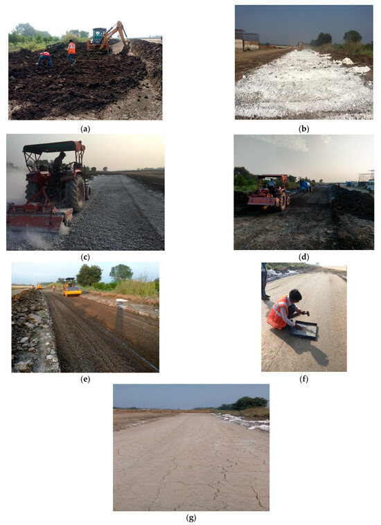 Stepwise construction of the trial section. (a) Ripping the BC soil for treatment. (b) Spreading lime. (c) Mixing using a tractor with a rotavator. (d) Spreading chemicals with water. (e) Rolling using a 10-ton vibratory roller. (f) Density test on the finished surface. (g) Finished surface after treatment.