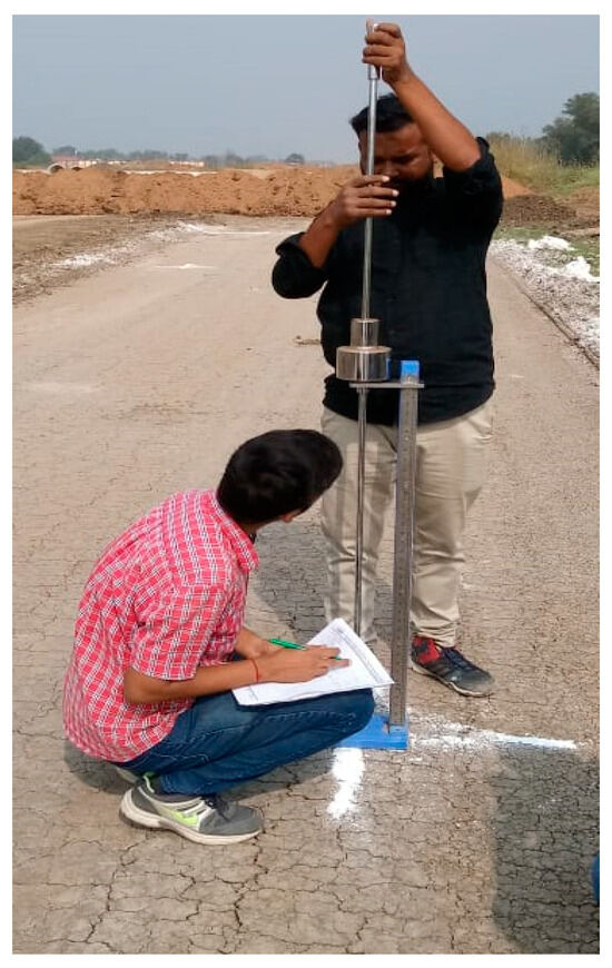The second test section (Section II) was constructed with lime stabilization and compacted to a depth of 250 mm. Steps 1 and 2 followed to construct lime lime-treated test section (Figure 8a–c). The required quantity of lime was spread over the back cotton soil and mixed with the rotavator. The required quantity of water (OMC) was spread over the lime-mixed soil using the water tanker and then compacted using the 10-ton vibratory roller. After 7 days of curing, the density of the compacted layer using the core cutter apparatus was measured, as shown in Figure 8f. The degree of compaction achieved was 95%.
