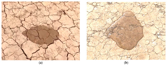 Simple water affinity test trial section surface. (a) Water affinity on the lime-treated surface. (b) Water affinity on the chemical + lime-treated surface.