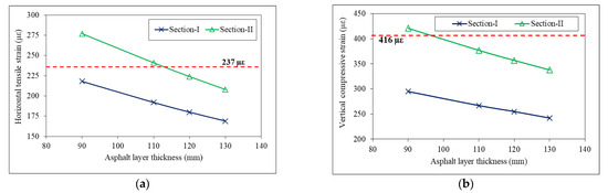 Variation of strain vs. various asphalt layer thicknesses. (a) Fatigue performance check. (b) Rutting performance check.
