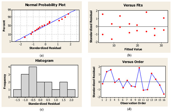 Residual plot for CBR. (a)Normal probability plot; (b) Versus fits; (c) Histogram; (d) Versus order.