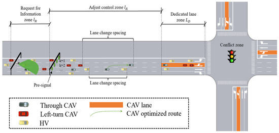 Most of the above studies assumed that, on the one hand, the default HV also participates in the network connection, and on the other hand, the default HV does not exhibit lane-changing behavior. Both of these assumptions are unrealistic. If we take into account how an HV changes lanes when it is not connected to the network, it requires us to obtain the steering information of the HV upstream of the intersection in advance. Pre-signal lamps were initially used for bus priority [27]. In particular, this article innovatively collects HV lane change information by setting up a request for information zone with the assistance of pre-signal lights.