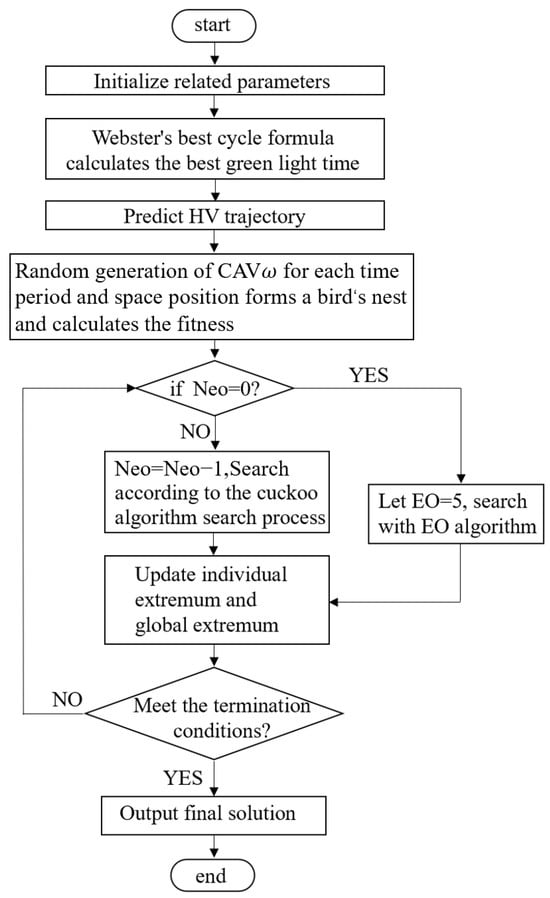 In the two-layer model, the signal light phase optimization is relatively simple, while the lane change strategy and acceleration optimization in the lower model is a complex nonlinear optimization problem with multiple constraints and multiple variables. Thus, there is a problem of a large solution space. For this reason, we design an improved cuckoo algorithm solution model with strong search performance combined with the EO algorithm based on the optimal phase duration calculated by using Webster’s optimal cycle formula. We find the optimal solution for the objective function established in Section 3.3.