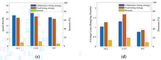 Comparison of the effects of two control strategies. (a) Vehicle throughput, (b) Vehicle delay, (c) Average vehicle speed, (d) Average number of lane changes.