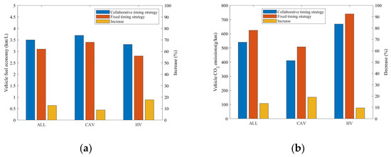 In terms of vehicle fuel economy and CO2 emissions, it is plain to see from Figure 5 that when cars arrive at the intersection with a Poisson distribution, the cooperative timing strategy considered in this article improves the fuel economy of heterogeneous traffic flows compared with the fixed timing strategy, improving the fuel economy of all vehicles, CAVs, and HVs by 12.9%, 17.9%, and 8.8%, respectively, and the CO2 emissions of all vehicles, CAVs, and HVs by 13.5%, 19.1%, and 9.6%, respectively. The vehicle fuel consumption and CO2 emissions are estimated using the fuel consumption model [31]. The spatiotemporal trajectory of the CAV in Figure 6a shows that due to the advanced acquisition of intersection signal control information and HV turning information, the CAV can follow a more reasonable trajectory to avoid vehicle stalling, which in turn increases the capacity of the intersection, improves vehicle speed, and makes full use of green light time. To prove this point in depth, a random CAV is selected to analyze the acceleration change under the two different control strategies, as shown in Figure 6b. There is a clear distinction between the fixed timing strategy and the cooperative timing strategy proposed in this article in terms of reducing the speed fluctuations of the CAV.