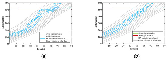 Figure 7a–c display the average delay for heterogeneous traffic flow, CAVs, and HVs when the saturation flow rates are 0.5, 1.0, and 1.25, respectively. As traffic demand increases, the typical delays for mixed traffic flow, CAVs, and HVs all increase significantly. When the CAV penetration rate rises, the average delay for mixed traffic flow and HVs decreases significantly for each demand level. This indicates that signal control for heterogeneous traffic flow based on pre-signal lights and CAV-dedicated lanes, as well as CAV trajectory optimization, can reduce the delay of mixed traffic flow and HVs when CAVs are more prevalent in mixed traffic flow, and the reduction in delay is most significant for HVs. Figure 7d–f show the reduction in general delay of heterogeneous traffic flow, CAVs, and HVs under different demand levels in contrast to the baseline case without CAV trajectory design and signal coordination optimization. Although CAVs’ trajectories are planned in a dispersed manner, their travel delay is significantly improved. When the rate of CAV penetration is high (70%), the reduction in delay for HVs also becomes significant, especially when the flow rate is excessively saturated (V/C = 1.25), with a delay reduction of over 7 s. The reason is that under a more reasonable phase timing environment, the proposed pre-signal lights and CAV-dedicated lanes provide more time and space resources for HV travel, allowing HVs to make adjustments in advance to pass through intersections at higher speeds, avoiding emergency braking and acceleration of vehicles and avoiding stopping at the stop bar. In Figure 8, the trajectories of HVs under different control strategies are illustrated using lane 3 (straight-through lane) as an example when 70% of CAVs are inserted. The trajectory segments in differing lanes are evident in light colours. In Figure 8a, the HV stops at the red light and starts when the light is green, resulting in significant fluctuations in the HV trajectories. Unfortunately, these HVs lose start-up time. Conversely, in Figure 8b, the HVs can pass smoothly and quickly through the stop bar, avoiding stopping at the stop bar and effectively utilizing the green light time. Pre-signal lights and CAV-dedicated lanes can effectively reduce the delay of HVs.