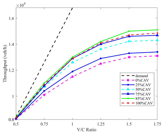 In addition, for similar reasons, the average passing capacity of intersections is also improved. Figure 9 compares and analyzes the positive effects of the CAV penetration rate on intersection passing capacity under different traffic demands. The tested CAV percentages were 0%, 25%, 50%, 75%, 85%, and 100%. The passing capacity reaches its upper limit when the traffic volume line becomes flat. Figure 9 shows that when the prevalence of CAV rises from 0% to 50%, the passing capacity is significantly improved, reaching 9.16%. When all vehicles are CAVs, a significant enhancement is observed, and the passing capacity reaches 13.36%. An interesting phenomenon is that the maximum enhancement is achieved when the CAV penetration rate is 85%, reaching 15.27%. Because of CAV-dedicated lanes, too low a percentage of HVs means that the traffic resources of HV lanes are idle. Therefore, the best effect is achieved when the CAV percentage is 85%, rather than 100%. These observations indicate that CAV trajectory organization can significantly enhance the passing capacity of intersections, but it requires a higher CAV penetration rate, and the setting of CAV-dedicated lanes has a significant influence on improving the passing capacity of heterogeneous traffic flow.