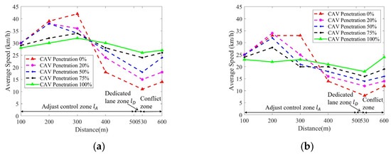 Figure 10a,c,e depict the average fuel economy of a variety of transportation flows. Figure 10b,d,f depict the average CO2 emission of a variety of transportation flows. The traffic demand conditions for CAVs and HVs are different for different CAV penetration rates. As traffic demand rises, the average fuel economy of heterogeneous traffic flow, CAVs, and HVs significantly decreases. The increased rate of CAV penetration leads to a significant improvement in fuel economy, especially under high traffic volumes. There are two reasons for this: on the one hand, appropriate signal control strategies provide reasonable travel time for heterogeneous traffic flow; on the other hand, CAV trajectory organization based on dedicated CAV lanes helps to avoid the stop-and-go motion of mixed traffic and smooth longitudinal trajectories. These benefits increase with the CAV penetration rate. Figure 11a,b show the spatial distribution of the average speed when V/C is 0.5 and 1.25, respectively. When all vehicles are HVs and the traffic is undersaturated, the spatial average speed gradually increases in the adjusted control zone within the first 300 m and then begins to slow until it reaches the stop bar (530 m), as depicted in Figure 11a. This is because some vehicles stop and queue up between 300 and 530 m during red lights. When compared, as shown in Figure 11b, due to traffic saturation, the spatial average speed begins to decrease at 200 m. The speed of oversaturated traffic flow at the stop bar is significantly smaller than that of undersaturated traffic flow. As the rate of CAV penetration rises, the speed fluctuations in the control adjustment zone decrease, especially when CAV penetration rates reach 60% or higher under saturated and oversaturated traffic demand. When all vehicles are CAVs, the spatial average speed of the entire control adjustment zone is comparatively reliable due to the smooth transverse trajectories of vehicles provided by trajectory design. The average speed of vehicles passing through the stop bar also increases with increasing CAV penetration rate as a result of the absence of stop-and-go traffic.