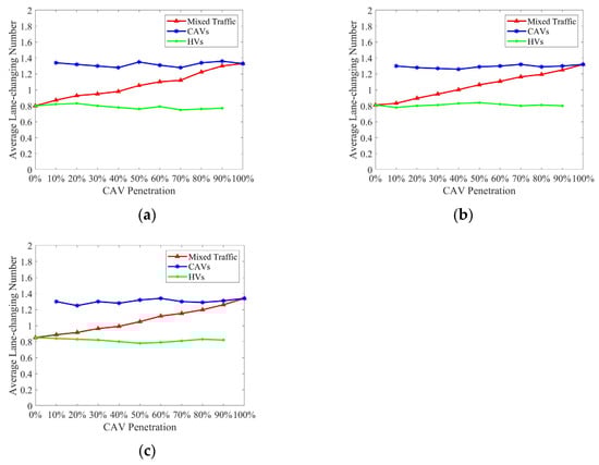 Impacts on the number of CAVs that change lanes under various demand levels. (a) Average lane-changing number (V/C = 0.50); (b) Average lane-changing number (V/C = 1.00); (c) Average lane-changing number (V/C = 1.25).
