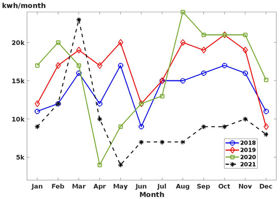 An example building was selected from the monthly energy usage statistics of the period of 2018–2021 (Figure 1). The energy usage profile indicates that this academic building has a usage pattern that resembles the academic year of an undergraduate student with the highest peak in April and May, owing to the following summer period. Energy usage has been constantly growing between 2018 and 2020. However, the value suddenly dropped in 2021 because of the COVID-19 pandemic, which resulted in lockdowns and a period of working from home. This reduction in energy usage has been steadily recovering to pre-COVID-19 levels and is forecast to rise further. In addition, the energy price will be much higher in the future as a result of inflation and conflicts. Thus, improvements in the building’s energy efficiency are one of the issues that needs to be addressed to achieve the energy initiative set by government policy.