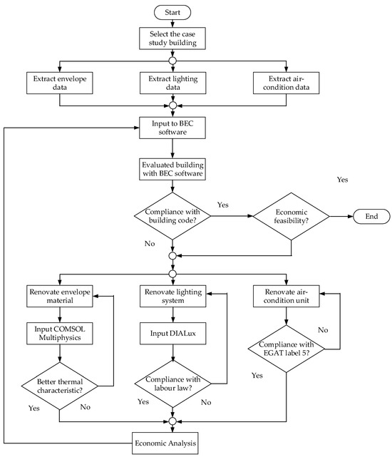 A building that has criteria for both area types that falls under Jurisdiction of Thailand Building Energy Code but not in compliance with the code due to the construction period that pre-dated the law was selected as a case study. The building, with characteristics similar to other commonly built buildings in the same category, was also taken into consideration to provide widely applicable results. The study process consisted of selecting the case study building for simulation. The floor plan of the building was used to extract the amount of lighting equipment and air conditioning units, and the components of walls, the roof, and windows. The data from the current building were evaluated using BEC software in order to determine whether each sub-system complies with building code. For the building envelope, the thermal transfer analysis on the current material used in the original building was simulated using COMSOL Multiphysics software. After that, the different material with a better thermal characteristic was evaluated in terms of the thermal transfer analysis and was selected as a renovation case. For the lighting system, the amount of equipment could be directly counted from the floor plan and the energy efficiency could be evaluated by using the BEC software. To renovate the lighting system, DIALux software (version 4.13) was used to simulate the replacement software to assess whether it can provide similar lighting quality to the current one. The efficiency of an air conditioning unit could be individually calculated and a better-efficiency unit could be selected for replacement. After the renovation process is completed, the building will be subject to another BEC evaluation in order to confirm that all sub-systems are in compliance with building code. Finally, the cost of the overall renovation process and the cash flow from energy cost reduction were calculated to determine the project feasibility. In addition, an increasing transformer spare power capacity result from load reduction could be used to support future loads. The overall process of the study can be summarized in a diagram as shown in Figure 3.