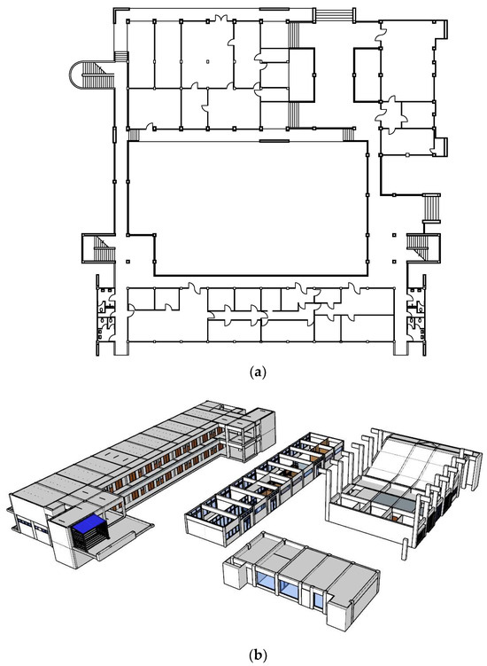 Building of the Department of Civil Engineering, School of Engineering, King Mongkut’s Institute of Technology Ladkrabang, Thailand: (a) floor plan; (b) SketchUp diagram.