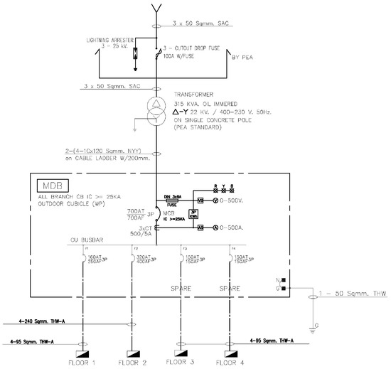 A single line diagram of the case study building is shown in Figure 5. The electrical load of the current building is supplied with power from a 250 kVA transformer through a main distribution board via a main feeder with 12 × 150, G-50 mm2 on a cable tray. The main circuit breaker consists of three poles with 400 AT before the power is fed through the distribution board onto each floor with a 160 AT circuit breaker and 4 × 95, G-10 mm2. The renovation includes the lighting and air conditioning units, which were replaced with newer technology with higher efficiency and lower power requirements. While the transformer is still the original unit, the connected load on each distribution board can be reduced and additional capacity can be provided for future loads or the size of the circuit breaker can be changed.