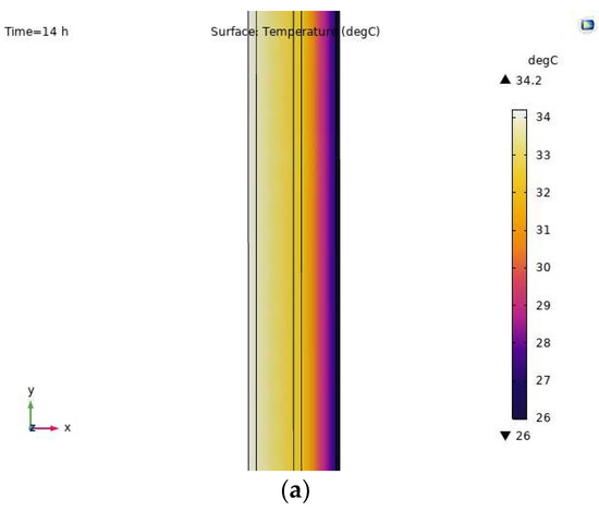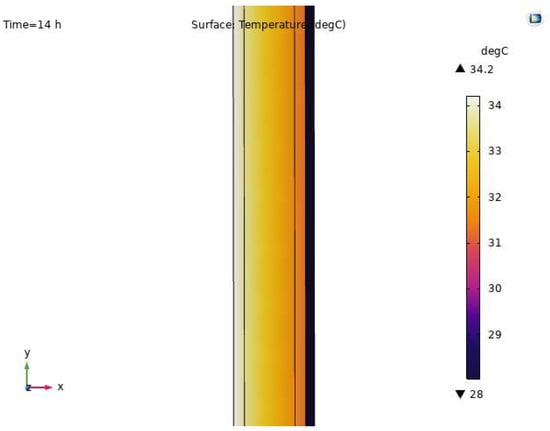The model of the original wall used in the case study was simulated using COMSOL Multiphysics 5.6. A simulation of the thermal transfer between the exterior and interior surface temperature throughout the daytime period was performed and the result is shown in Figure 6. The false-color diagram shows that the exterior heat can penetrate through the material without resistance, which results in a high interior surface temperature. The current material used in the building envelope consists of the plaster and dry clay brick, which has high thermal conductivity and result in a high heat transfer coefficient. This thermal characteristic directly affects the OTTV of the building envelope.