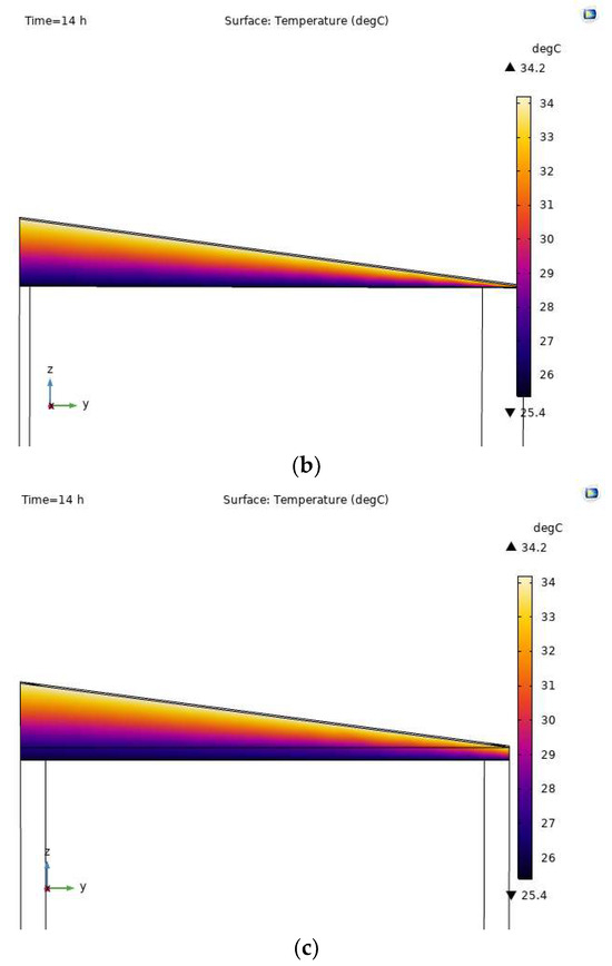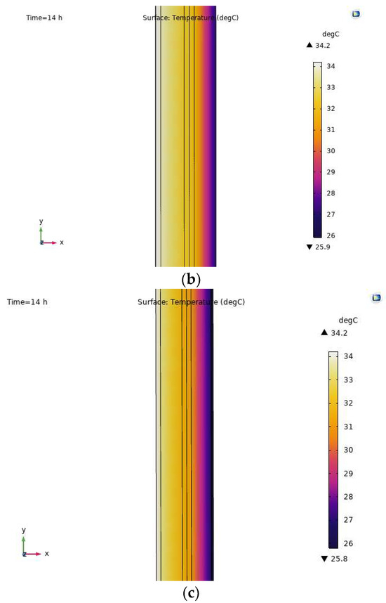 Thermal transfer results for various types of renovated roofs over 14 h: (a) renovated roof, case 1; (b) renovated roof, case 2; (c) renovated roof, case 3.
