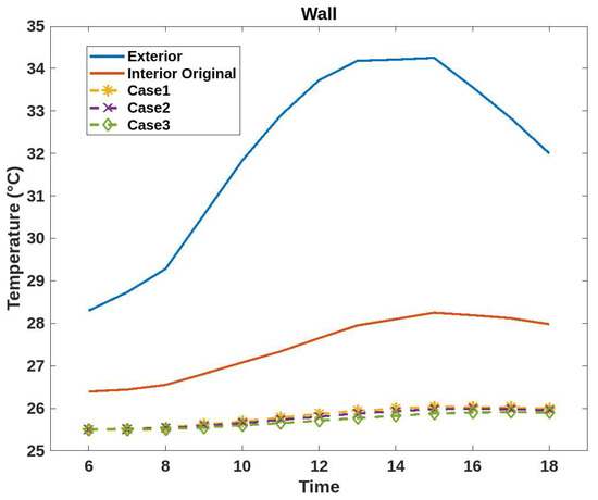 Figure 8 shows the results of plotting the obtained surface temperatures of both the exterior and interior of the original wall and the various renovated roof cases throughout a day. The results show that the original wall has a lower thermal resistance, resulting in a higher temperature inside the building. In regards to the renovation case, the interior temperatures are reduced significantly in all three cases because of the additional fiberglass insulation that decreases the thermal transmittance of the wall. A material such as a gypsum board provides an additional reduction in thermal transfer but not on the same scale as a fiberglass insulator. So, the wall material and component of renovation case 1 were selected as the wall-type envelope replacement due to easier installation and a slightly different efficiency in comparison with other cases.