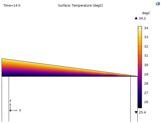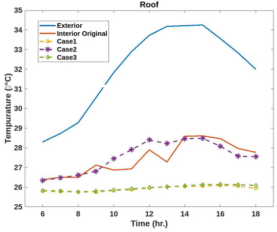 A model of the original roof in the case study was simulated using COMSOL Multiphysics 5.6. The simulation was conducted similarly to the one for the wall by calculating the thermal transfer between the exterior and interior surface temperatures throughout a day. The results are shown in Figure 9.