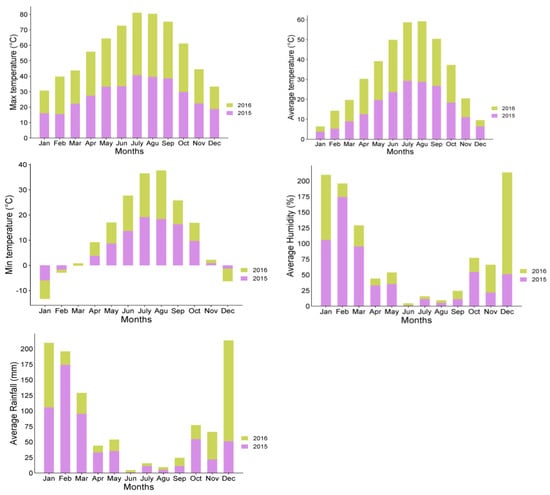 This study was conducted on six pistachio trees per “ON” and “OFF” year (Pistacia vera cv Uzun) that were 34 years old and grafted on P. vera rootstocks with uniform size and canopy at Dr. Ahmet Munir Experimental Area of Gaziantep Pistachio Research Centre during 2015-2016. To fully understand the AB mechanism, the flowers of OFF year trees were cut off artificially. The shoots, leaves, peduncles, and nuts were collected from “ON” and “OFF” year trees approximately 45 DAFB (Days After Full Bloom) in 10-day intervals from May to September (Table 1). Samples were fixed in a lyophilizer (Ilshin Lab. Co) for one week and were stored at +4 °C. To ensure a comprehensive interpretation of the findings, meteorological data for the study period were obtained from a public meteorological station within the orchards (Figure 1).