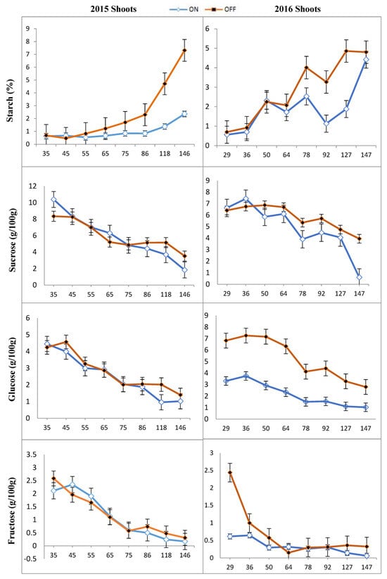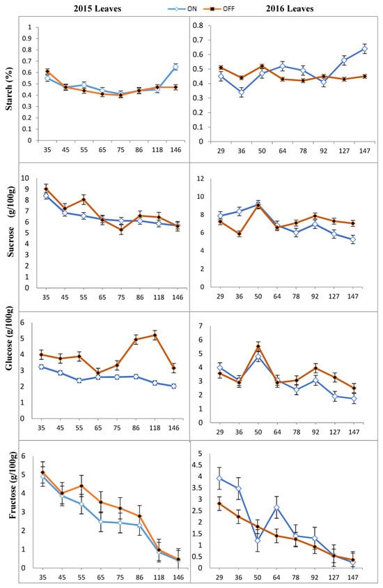 Based on the findings, the content of sucrose, glucose, and fructose was high during the initial sampling period (35 and 36 DAFB) in both “ON” and “OFF” trees, both in leaves and shoots. However, after some fluctuations, these sugar concentrations gradually decreased throughout the season in 2015 and 2016 (Figure 2 and Figure 3).