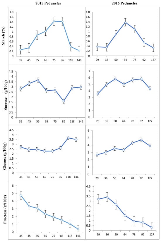 The sucrose content in the peduncles of “ON” years varied, ranging from 1.64 to 3.78 g/100 g in 2015 and from 3.49 to 5.82 g/100 g in 2016. The lowest sucrose concentration in peduncles was observed 86 DAFB in 2015 and 22 DAFB in 2016. On the other hand, the highest sucrose concentration in peduncles was observed in samples collected from 55 DAFB in 2015 and 50–92 DAFB in 2016. From 15 to 22 DAFB, sucrose concentration remained relatively stable, followed by a decrease for up to 36 DAFB. In 2016, the amount of sucrose in peduncles increased from 34 DAFB to 65 DAFB, and after a slight decrease, it increased again. However, in 2015, a decrease in the amount of sucrose in the peduncles was observed 86 DAFB. The glucose concentration in peduncles remained constant until 86 DAFB and then increased but decreased again in the last sampling period. The fructose concentration of peduncles steadily reduced throughout the season in all years studied (Figure 4).