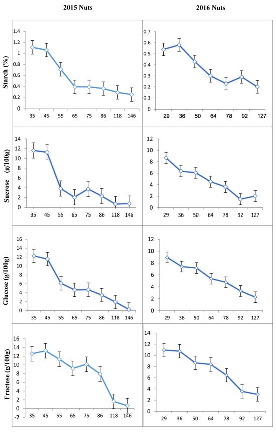 In contrast to nut samples, the content of starch in peduncles was initially low in the spring after full bloom, followed by a sharp increase 86 DAFB in 2015 (Figure 4) and 64 DAFB in 2016 (Figure 4). However, this increase was followed by a decrease in the amount of starch during kernel development, reaching a similar level at the beginning of the season in 2015 and 2016. The patterns of changes in the amount of starch in fruits were the same in 2015 and 2016 (Figure 5).