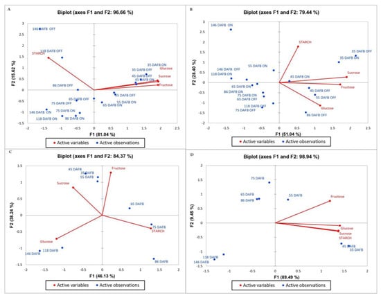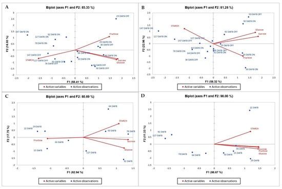 In the year 2015, PC1 accounted for 46.13% of the total variance, whereas PC2 explained 38.24% of the variance in peduncle samples. These two components together may explain a total of 84.37% of the variance. Starch was negatively correlated with all sugar types. The correlation between fructose and glucose was also negative. While sucrose and fructose were high in the first days, starch increased afterward, and glucose was high in the last periods (Figure 7). In 2016, PC1 could explain 62.94% of the total variance, whereas PC2 could explain 17.75%. These two components could explain 80.69% of the total variance. Fructose was high during the first days and then decreased. In particular, sucrose and glucose increased during the last periods. Starch was positively correlated with those other than fructose, and fructose and other sugars were negatively correlated (Figure 6).