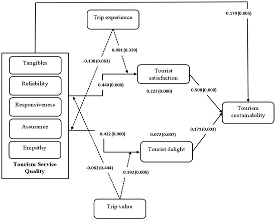 p-value = 0.007) were statistically significant. Given that the direct effects of service quality on tourist satisfaction and the sustainability of tourism are also significant, this suggests partial mediation by both tourist satisfaction and tourist delight in the relationship between service quality and the sustainability of tourism.