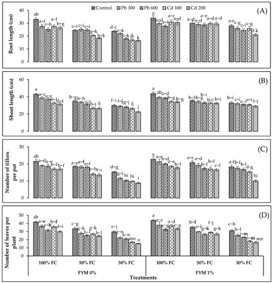 Effects of farmyard manure and drought on root length (A), shoot length (B), number of tillers per pot (C), and number of leaves per plant (D) of ryegrass in Pb- and Cd-contaminated soil. The standard errors and means of four replicates are represented by the error bars and columns, respectively, and different small letters on columns show the statistical difference (i.e., significance and/or non-significance) among different means (p ≤ 0.05). FC, field capacity; Pb, lead; Cd, cadmium.